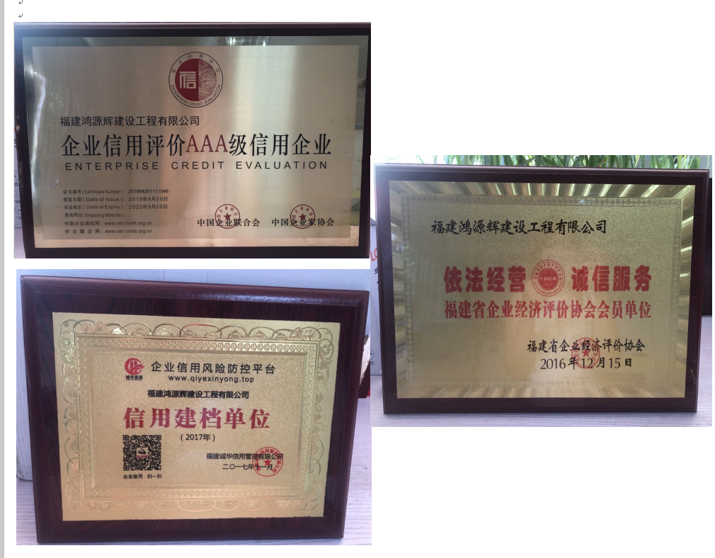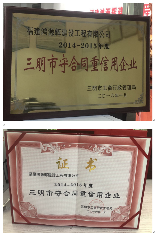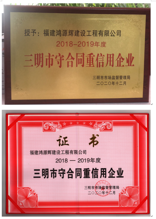 公司自成立以来,始终把“守合同重信用”工作做为促进企业管理的重要工作来抓,把“守合同重信用”视为企业的发展之根本。为此,公司指定了专人负责合同管理,制订了规范的合同管理制度,其中对合同的订立、评审、签订、履行、过程控制、违约责任、纠纷的处理等都做了详细的规定。在企业日常的经营活动中,讲诚信重质量,认真履行每一份合同。近2年来,公司承建的大小工程约105个,竣工率达到95%,公司承建的建筑工程合格率和合同履约率均达到100%。分别在2016年获得三明市工商行政管理局授予的“2014-2015年三明市守合同重信用企业”、 2020年获得了三明市市场监督管理局授予的“2018-2019年三明市守合同重信用企业”。
