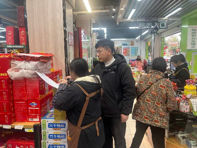 春节临近,超市作为群众采购年货的主要场所,其商品质量、食品安全、消防安全和诚信经营情况直接关系到群众的切身利益和节日安全。为切实守护群众“菜篮子”“米袋子”安全,规范超市经营行为,弘扬诚信经营理念,近日,溪口镇组织市场监管、应急管理等部门工作人员,对辖区内百家惠超市、便民超市等重点商超开展春节前专项检查暨诚信宣传活动。