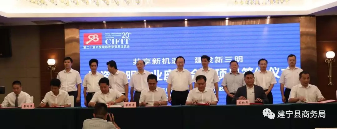 投洽会期间,三明市委、市政府举办了“投资三明企业座谈会暨项目签约仪式”活动,陈显卿、陈华伟和县有关乡镇、部门人员及部分客商出席了座谈会和签约仪式。陈显卿在活动中就我县的招商项目进行了推介。签约仪式上,我县与中国香港东南财富投资有限公司签订了“建宁县田园综合体(黄坊片区)项目”,该项目总投资1500万美元,其中利用外资900万美元。