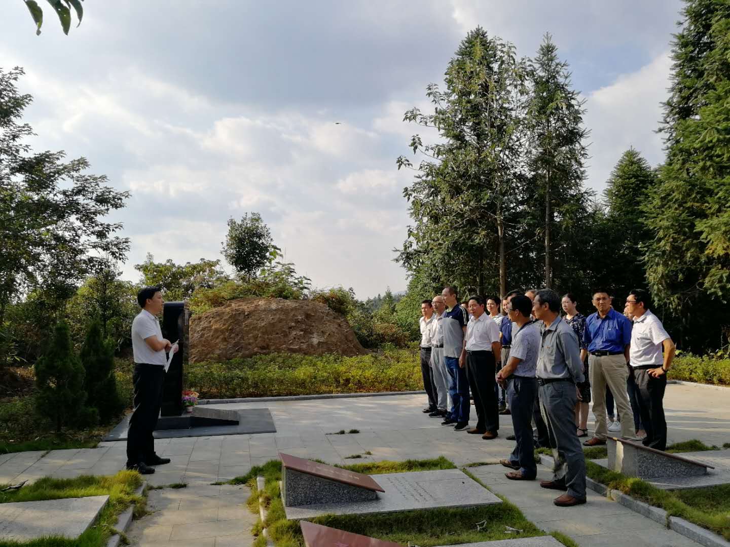 在烈士陵园,党支部书记陈可辉为大家讲述了革命先烈的英勇事迹,大家仔细聆听,从思想深处接受了一次爱国主义教育和革命传统教育的洗礼,进一步坚定了理想信念,强化了党性修养。