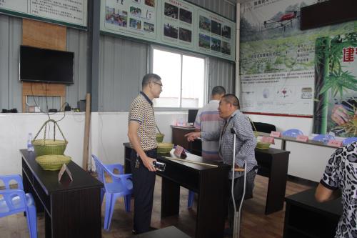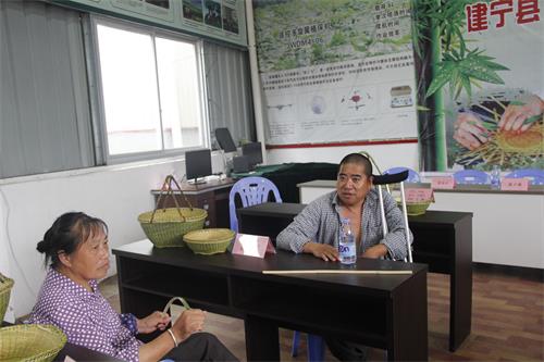 由溪口镇枫元村选送的残疾手工艺人占彩贞(肢体肆级)也参加了比赛,因手脚不方便,比赛所用的竹篾都是由其子王建福(肢体贰级)帮忙准备好,今天王建福也来到了现场,帮助母亲完成最后一步工作,终于在时限内完成了作品。