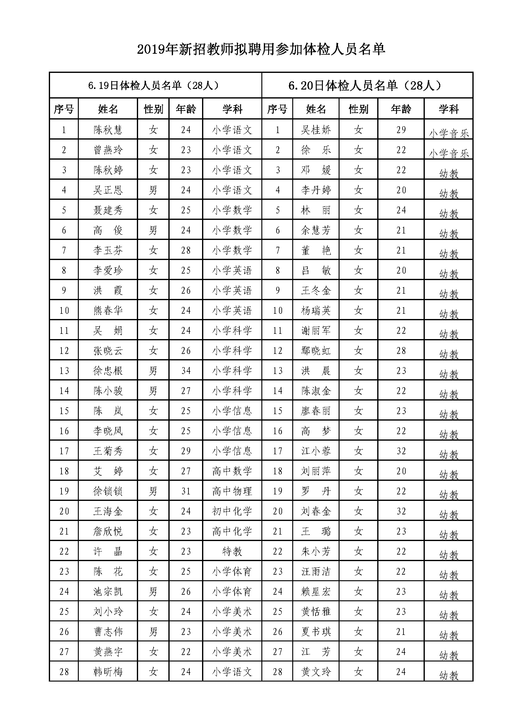 一、2019年建宁县新招教师入闱体检人员名单(56人,体检时间和人员名单附后)