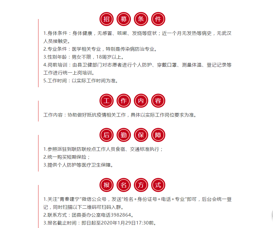 根据《共青团中央办公厅关于立即行动起来投身新型冠状病毒感染胡肺炎疫情防控工作的通知》要求和我县抵抗疫情的现实需求,为协助我县预防新冠肺炎输入,共同守护我们的美丽家园,现需招募我县返乡医学类、护理类、药剂类等相关专业大中专在校生或毕业生等志愿者赴一线协助做好疫情防控工作。