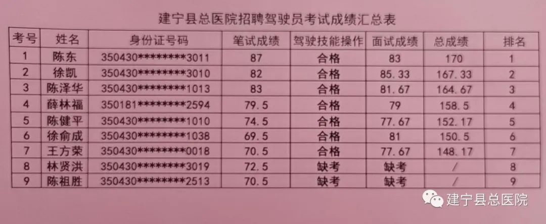 根据《建宁县总医院2020年招聘驾驶员的公告》精神,本着“公平、公开、公正、竞争、择优”的原则,经过笔试、驾驶员操作技能测试、面试等环节,现将各科成绩及总成绩公示如下,公示期满后,前三名入围人员进入体检阶段。体检标准参照事业单位招聘工作人员体检标准执行,参加体检人员需携带身份证原件和1寸近期免冠彩照1张,具体时间、地点,以我院工作人员电话通知为准。