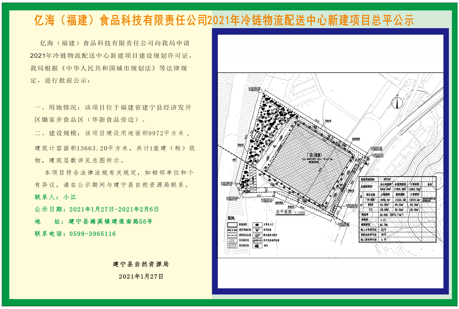 亿海(福建)食品科技有限公司2021年冷链物流配送中心新建项目总平公示