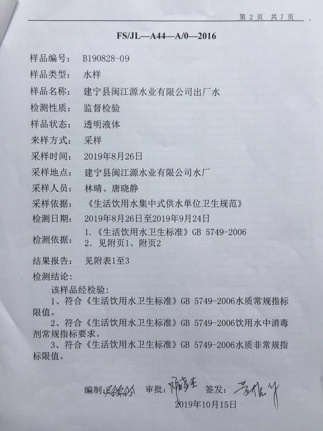 2019年8月份出厂水106项水质检测报告