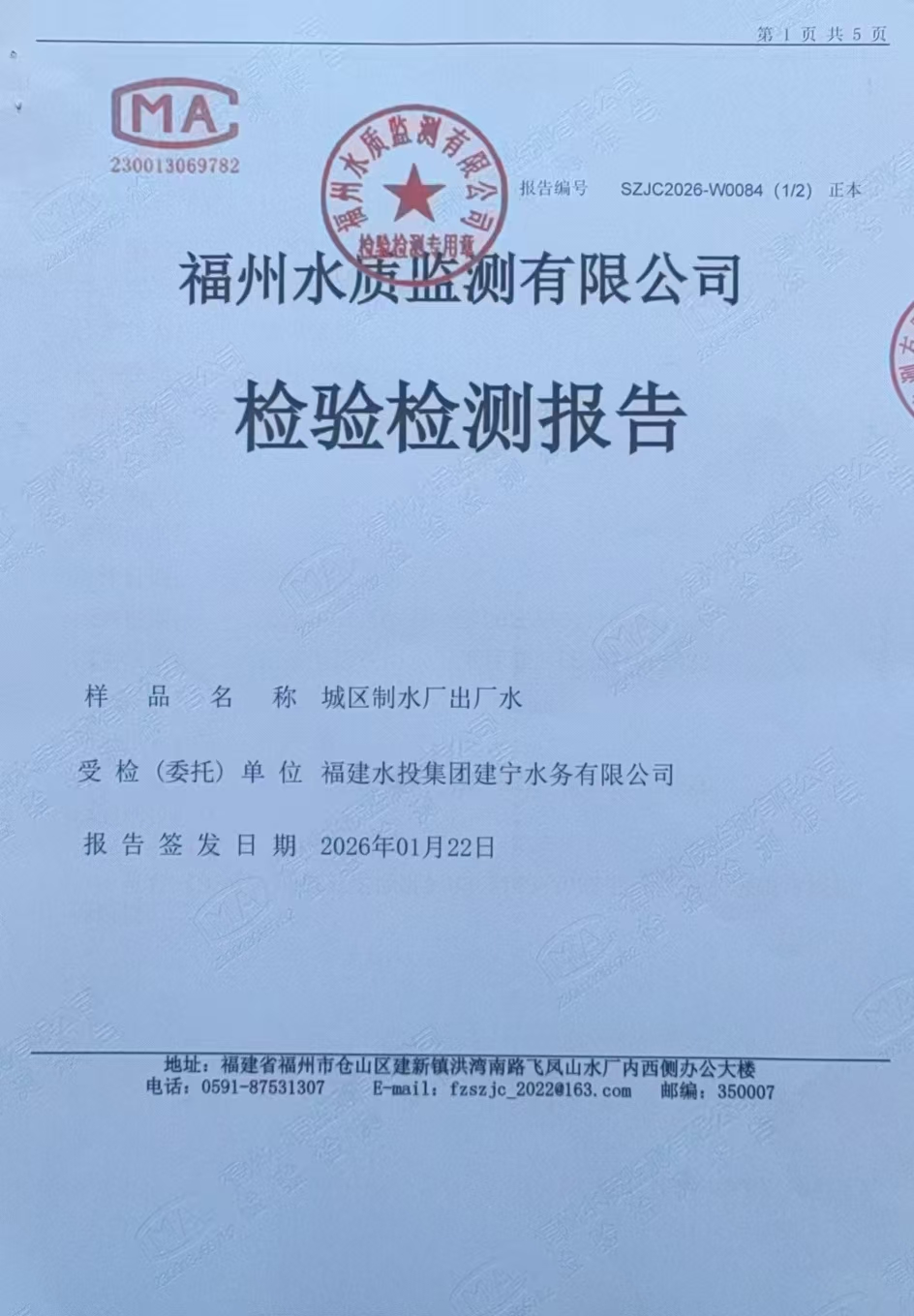 2026年1月份出厂水水质检测报告