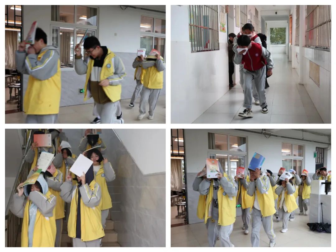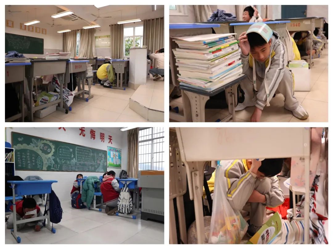 随着第一声应急警报声响起,演练正式开始,学生们迅速拿起身边的东西保护好头部,蜷曲身体,降低身体重心,藏在课桌下进行紧急避险。 随后,在任课老师的指挥下,学生们用课本护住头部,弯着腰,小步快走,沉着冷静、迅速有序地撤离教室。