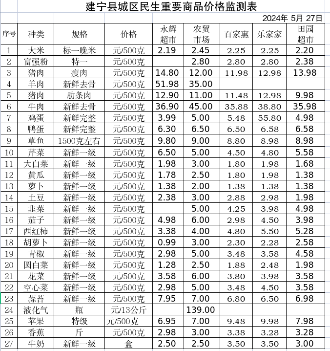 2024.5.27建宁县城区民生重要商品价格监测表