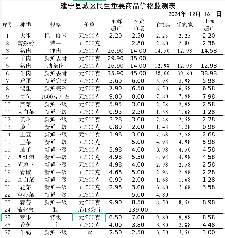 建宁县城区民生重要商品价格监测表