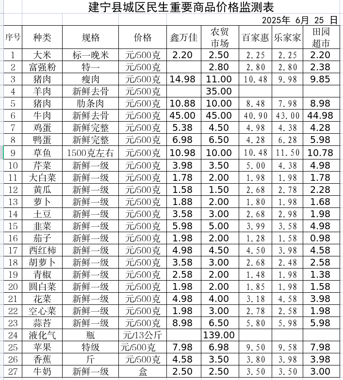 建宁县城区民生重要商品价格监测表