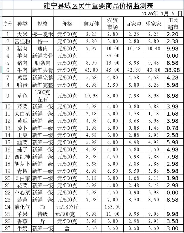 2026.1.6建宁县城区民生重要商品价格监测表