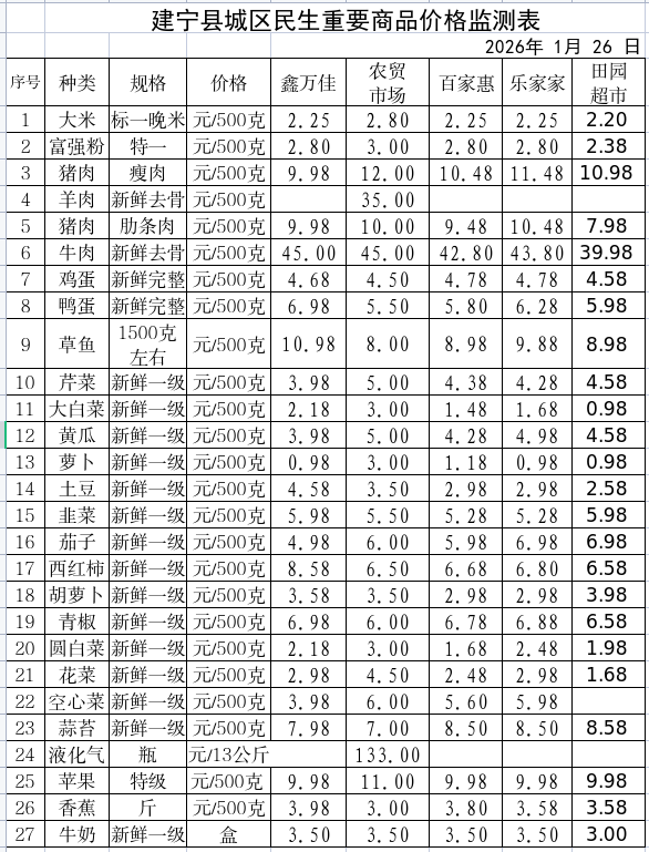 2026.1.26建宁县城区民生重要商品价格监测表