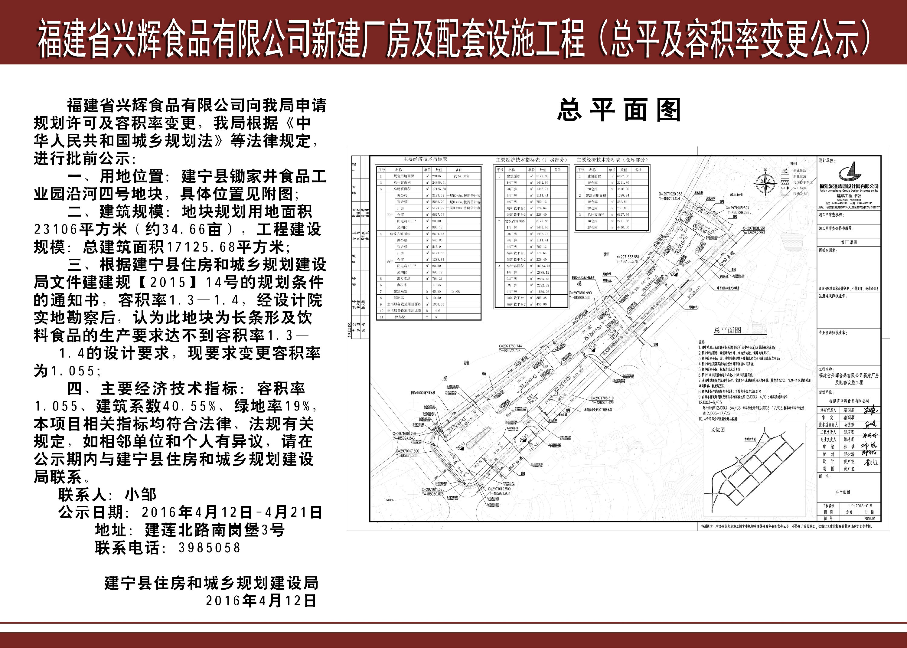 福建省兴辉食品有限公司新建厂房及配套设施工程(总平及容积率变更公示